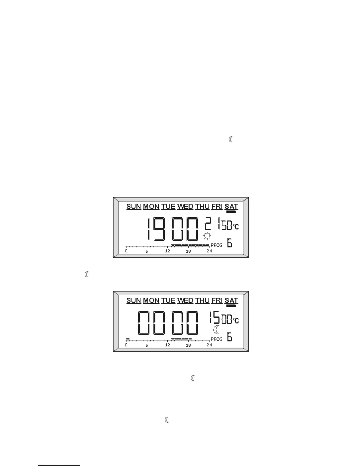 except 13:00 to 18:00. Press Prog. The thermostat enters program mode and the program of the current day