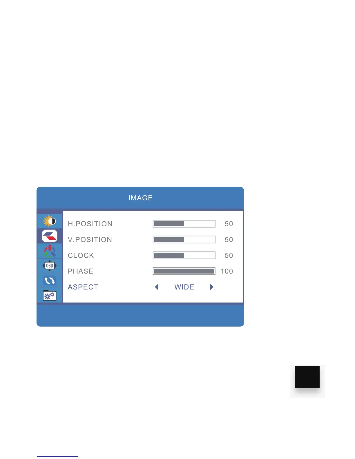 3. Use the “UP/DOWN” keys to browse H.POSITION, V.POSITION, CLOCK,