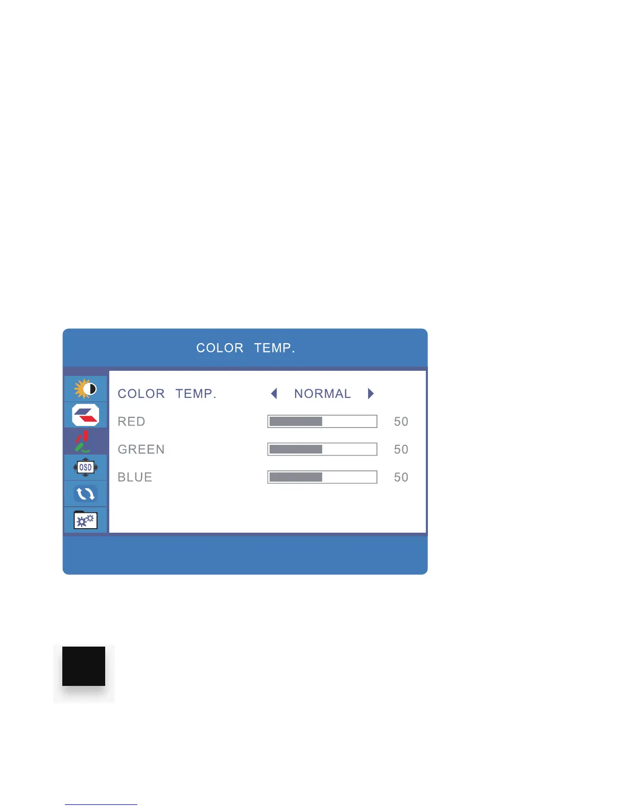 3. Use the “UP/DOWN” keys to browse COLOR TEMP, RED, GREEN or BLUE,
