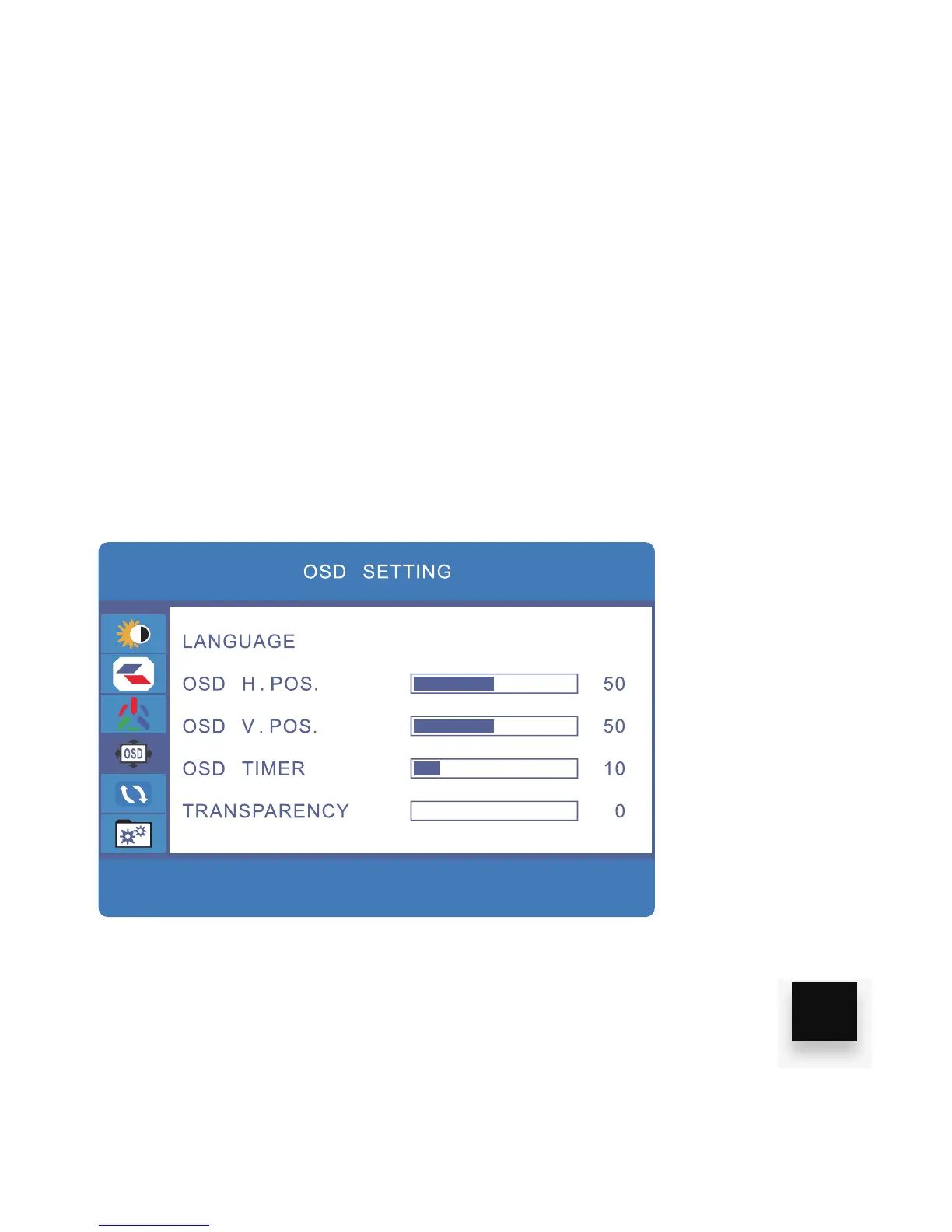 3. Use the “UP/DOWN” keys to browse LANGUAGE, OSD H.POS., OSD