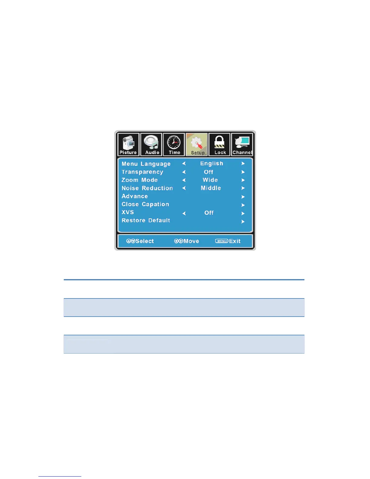 3. Use the ▲/▼ buttons to highlight an individual SETUP option, use the ◄/► buttons to