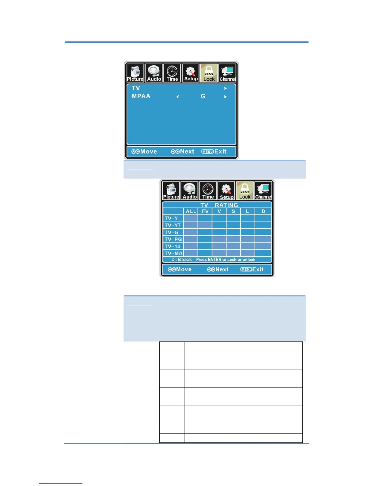 Use the ▲/▼ buttons to select N/A, G, PG, PG‐13, R,