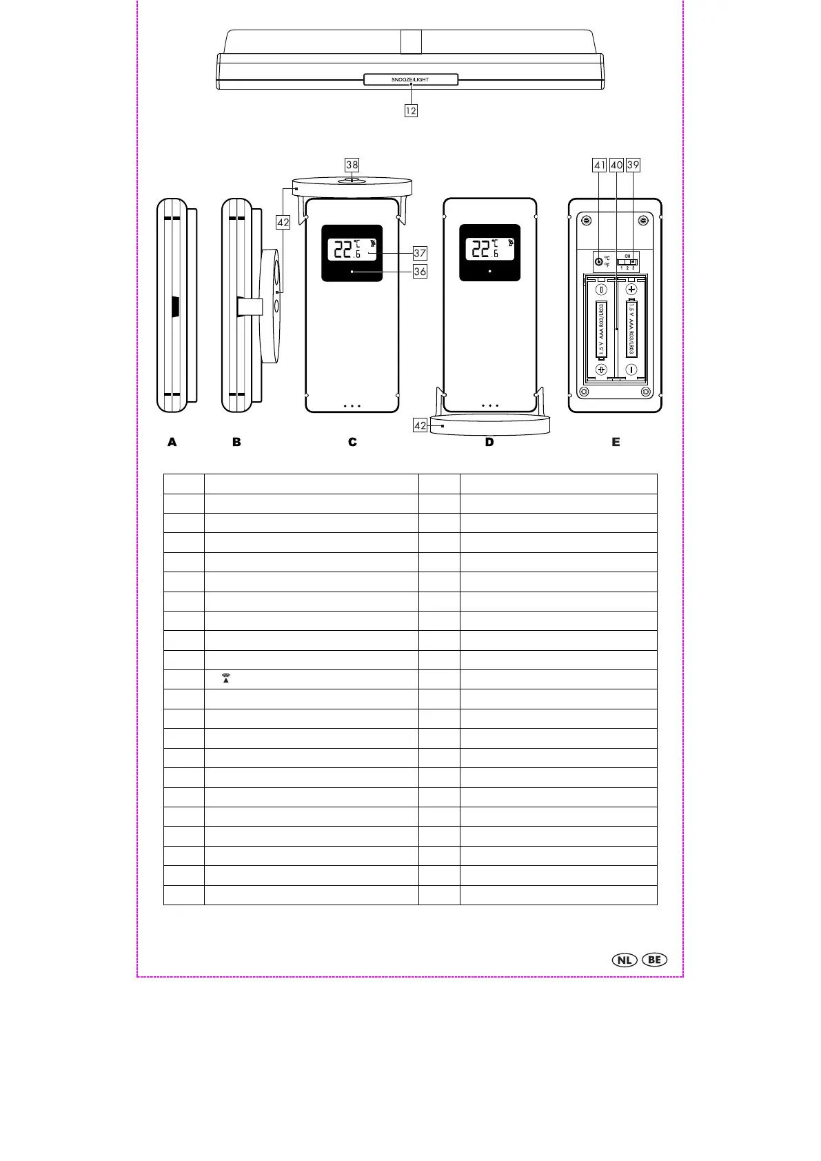 12 SNOOZE/LIGHT-toets 33 RESET-toets