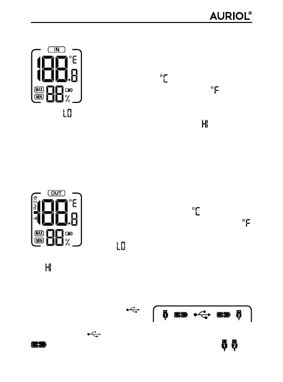 bis 65 °C (bzw. -4 °F bis 149 °F) unterschritten, bei Anzeige