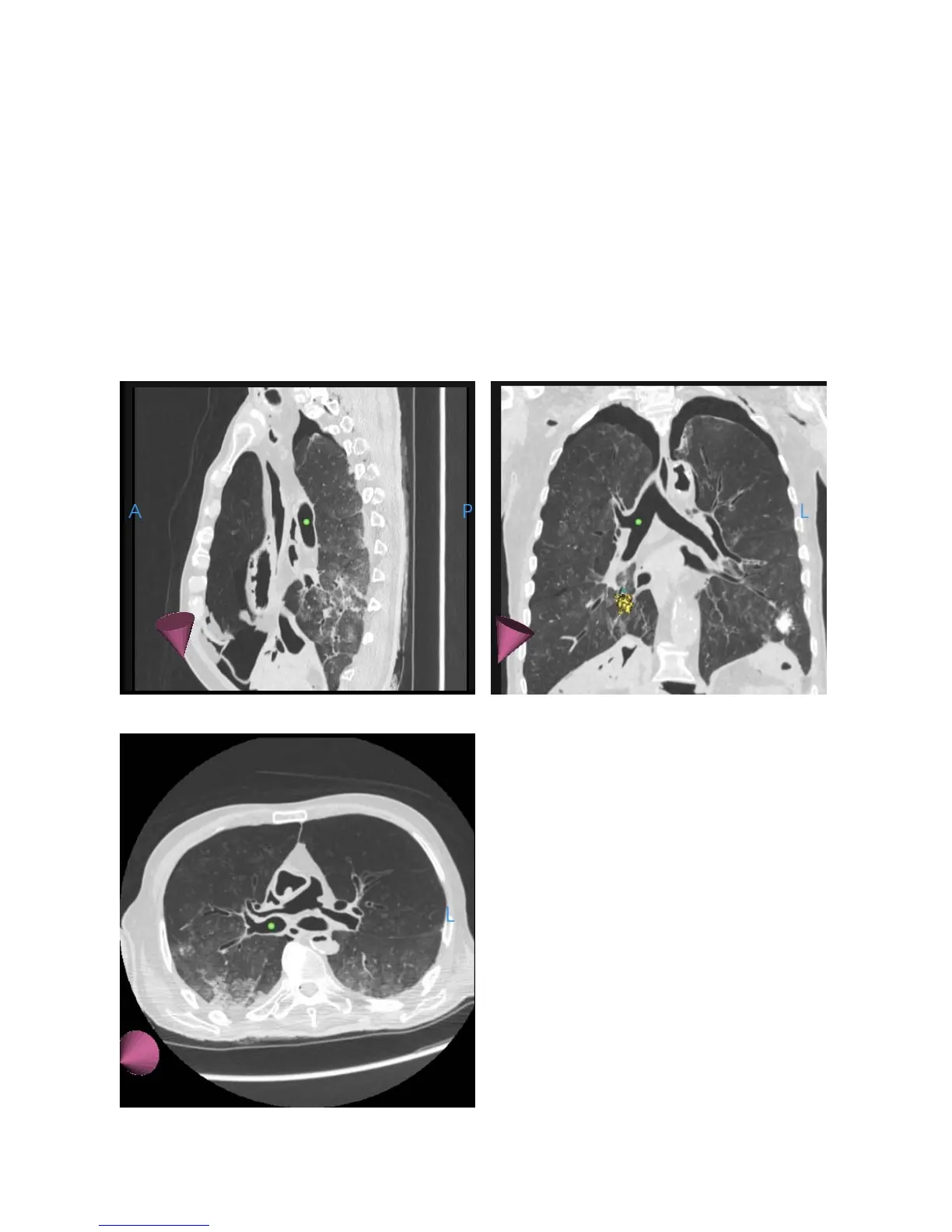 In the following images, the axial, sagittal, and coronal slices of the CT scan at