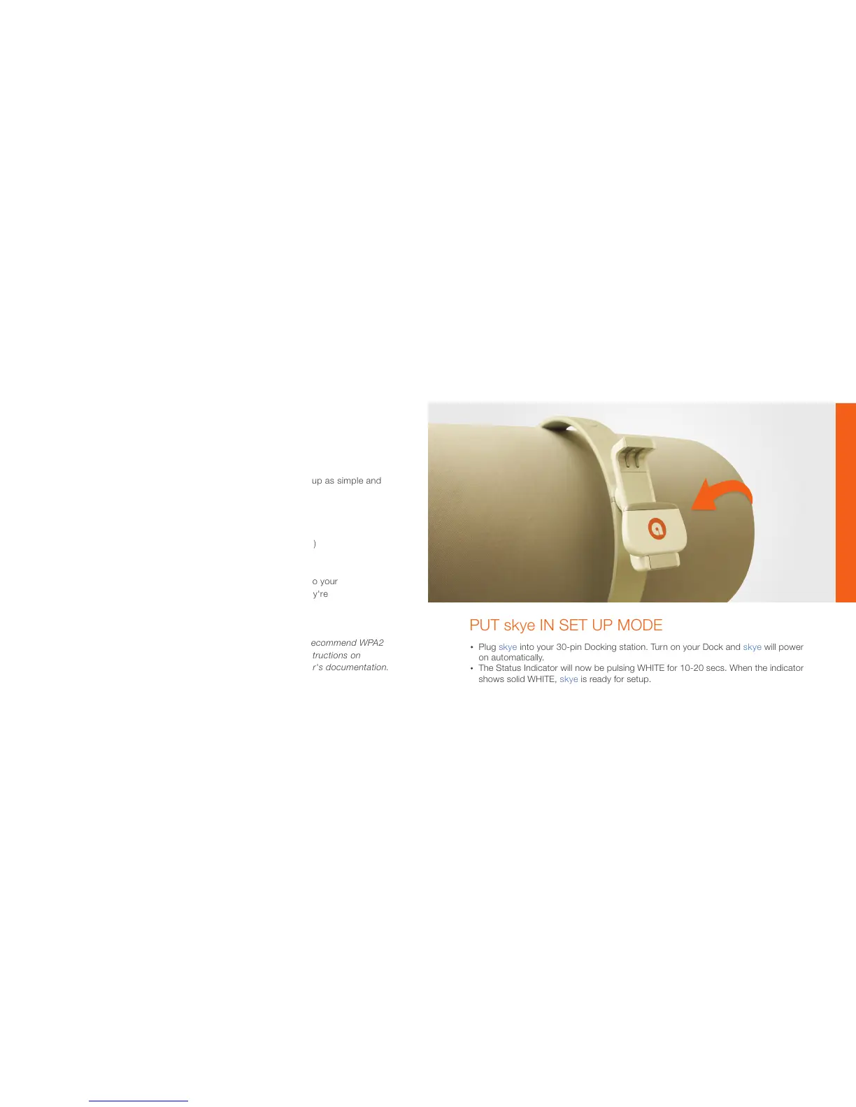 Plug skye into your 30-pin Docking station. Turn on your Dock and skye will power