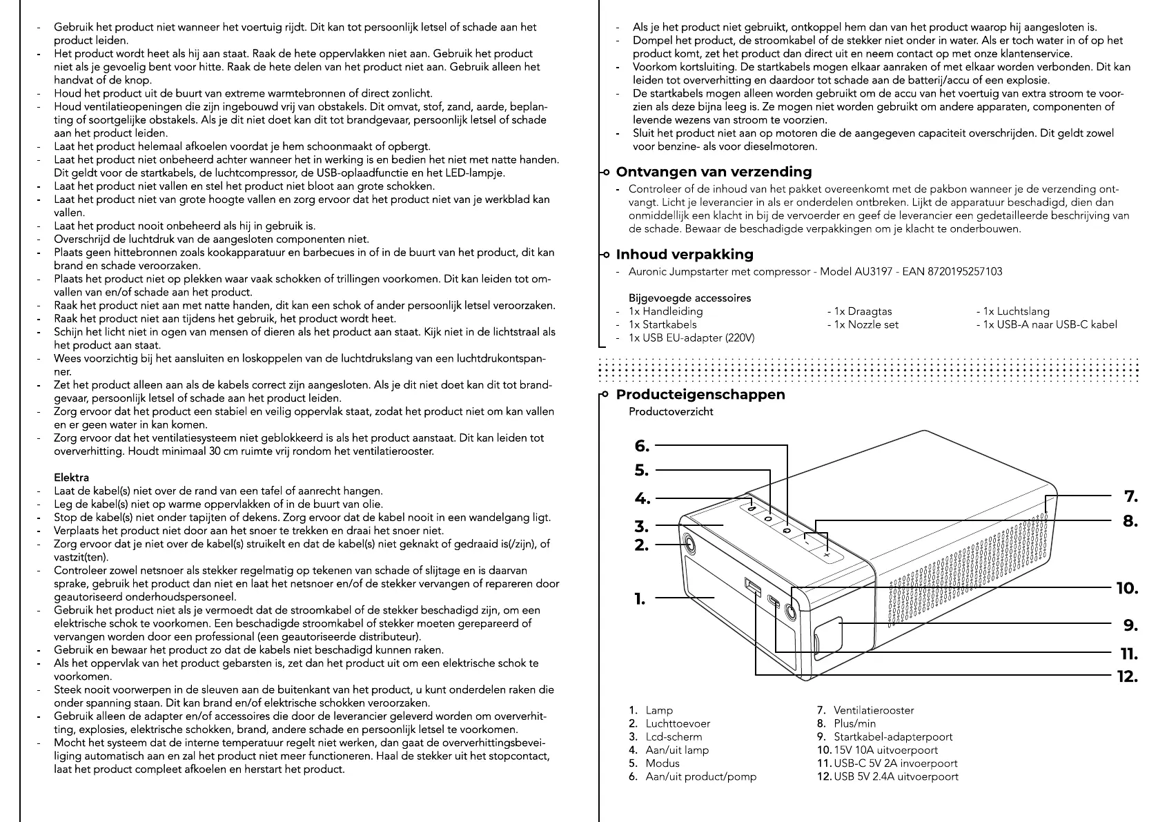 Dit geldt voor de startkabels, de luchtcompressor, de USB-oplaadfunctie en het LED-lampje.