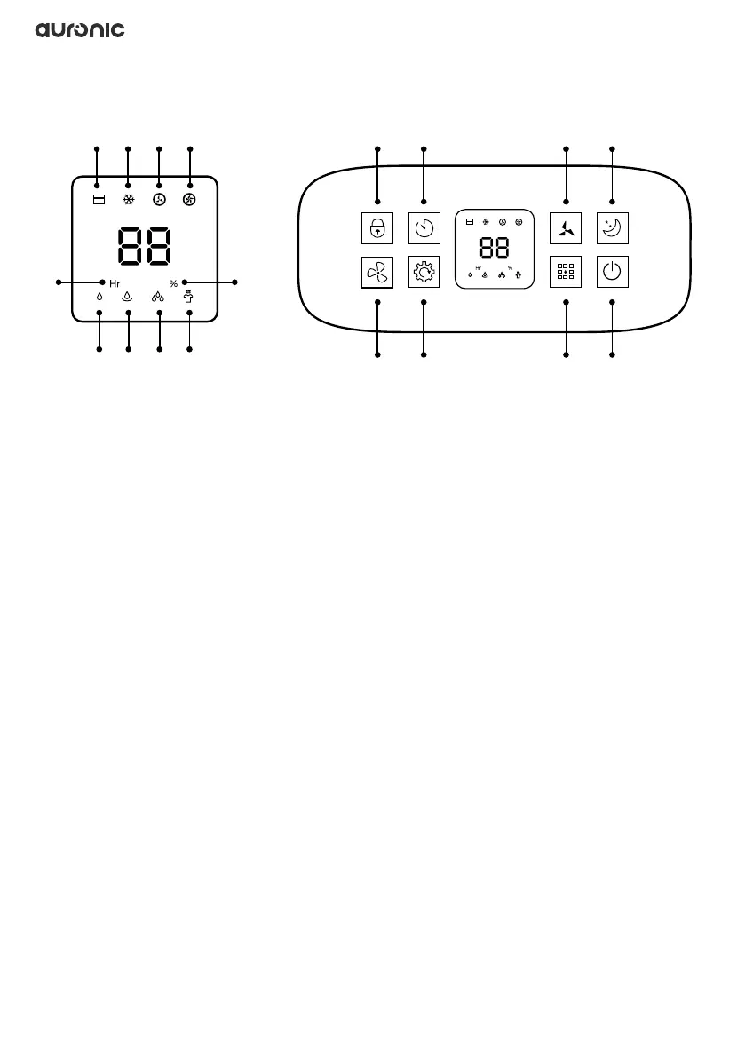 15. Mode: Touch repeatedly to set the desired mode to manual dehumidication, continuous