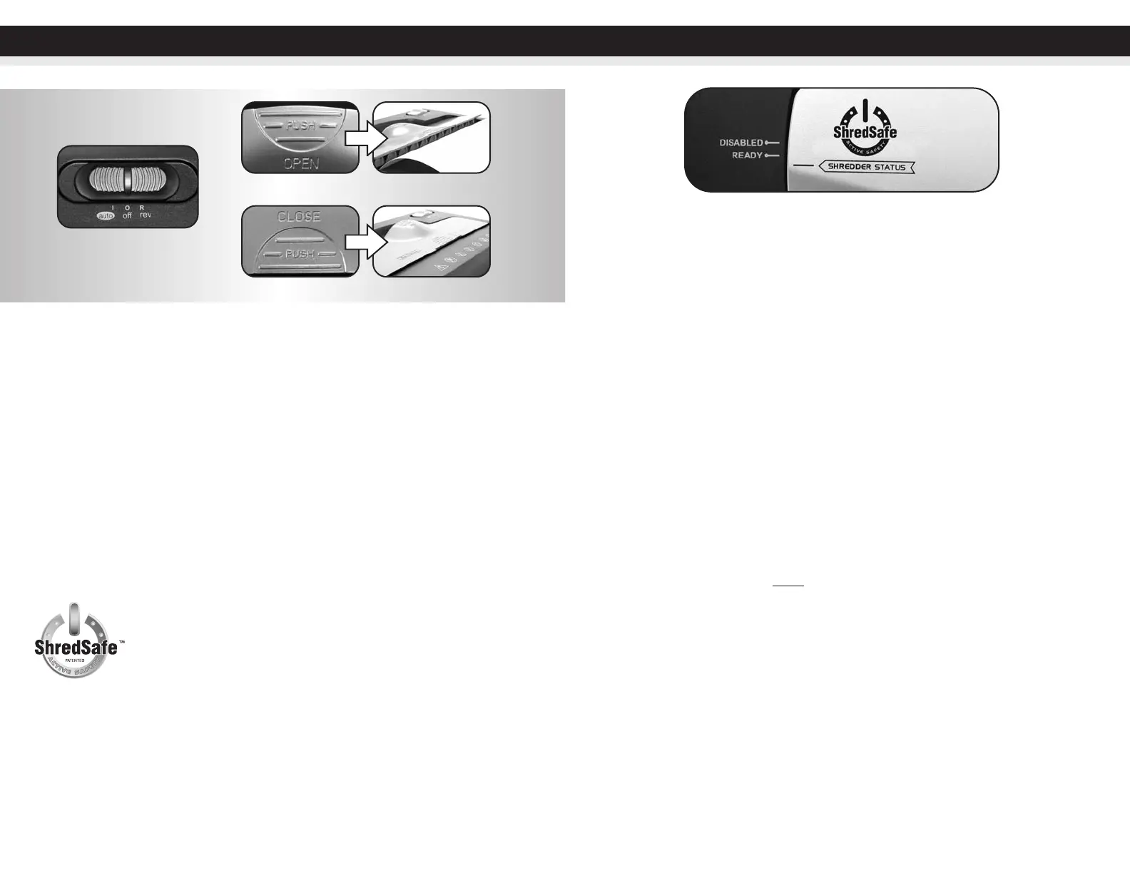 LED light indicates the shredder is “On” and ready to use. Press the designated “PUSH OPEN” area