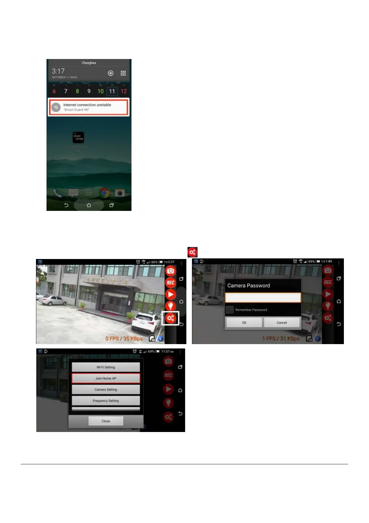 □ On your smart phone/tablet screen, click on “SETTING” icon . Enter camera default password “12346578”.