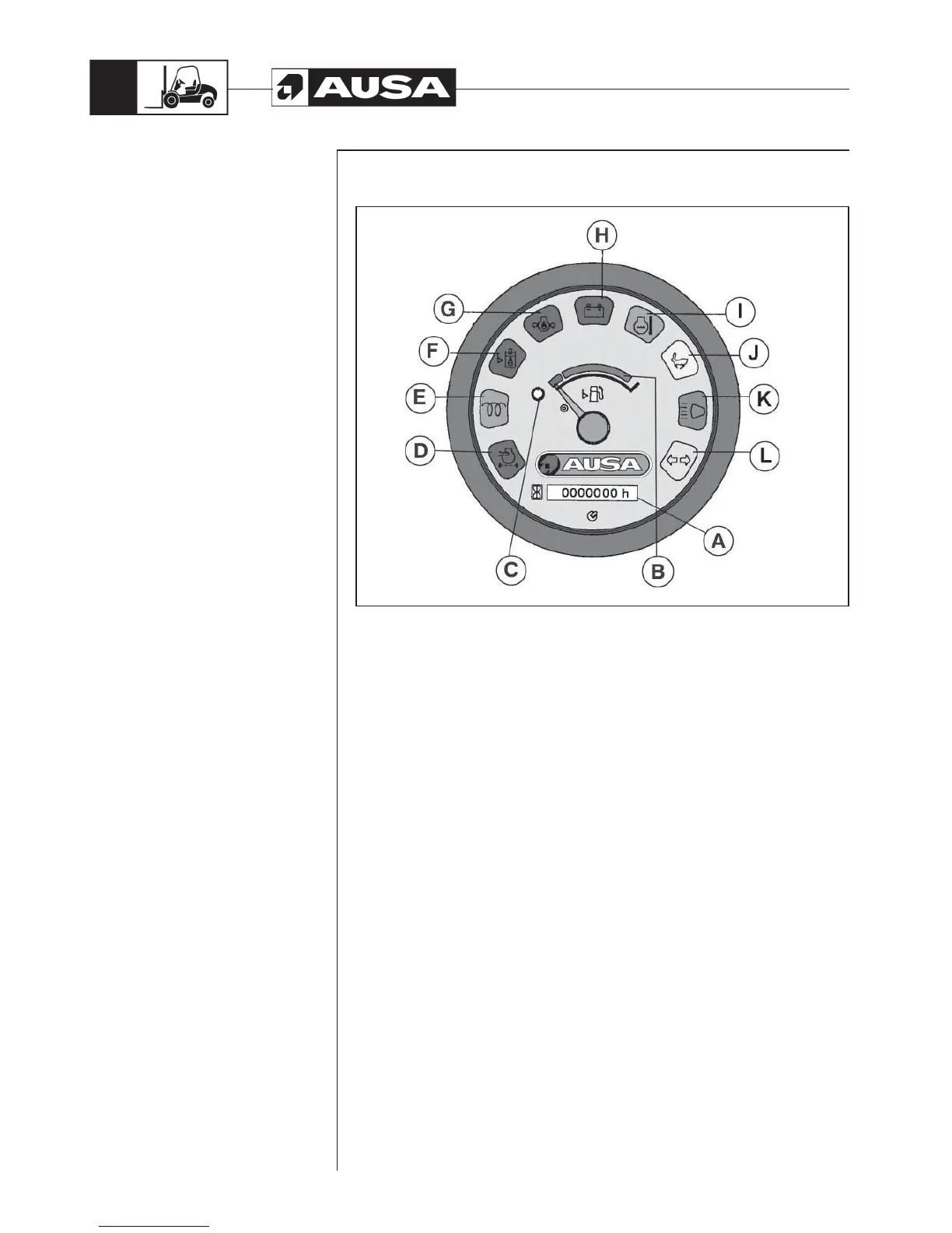 A- Hourmeter. This gauge indicates the total running time of the forklift engine to