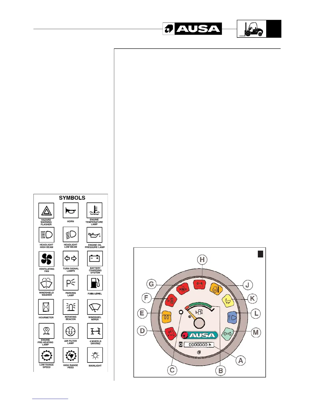 A - Hourmeter. This gauge indicates the total running time of the forklift engine to enable ser-