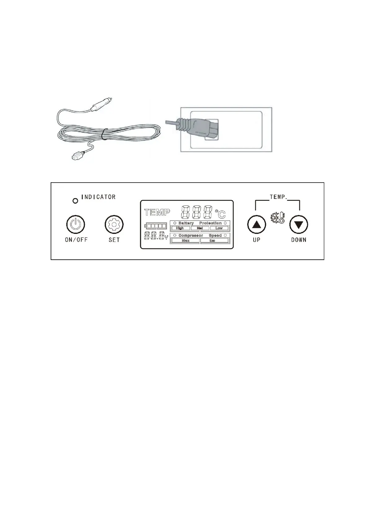 RED, and the display is on and you can set the temperature, or working mode, or car battery