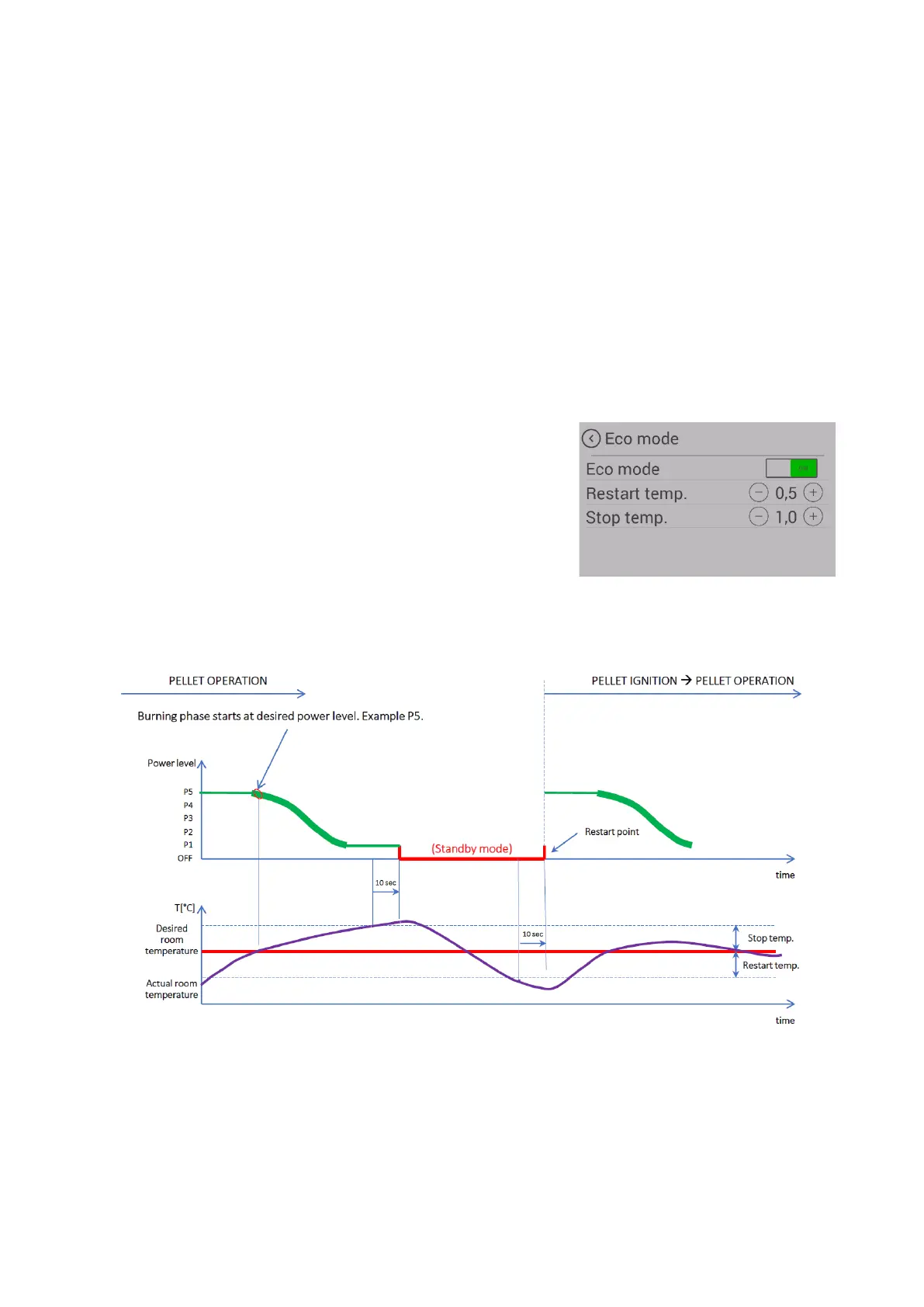 When the ECO mode is activated, the stove switches off once the desired room setpoint temperature