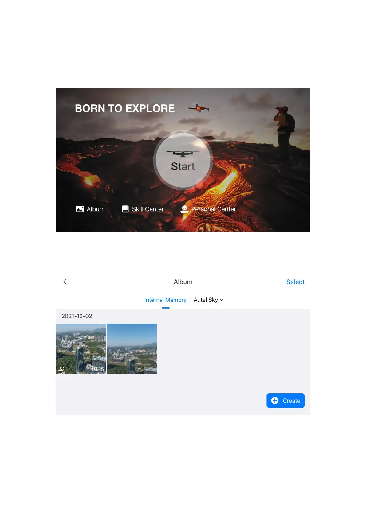 memory, and device storage (Autel Sky) options. Photos and videos can be downloaded to