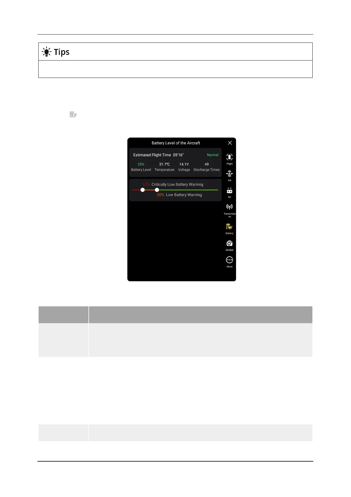Click " " to enter the "Battery Level of the Aircraft" interface, the user can view the basic
