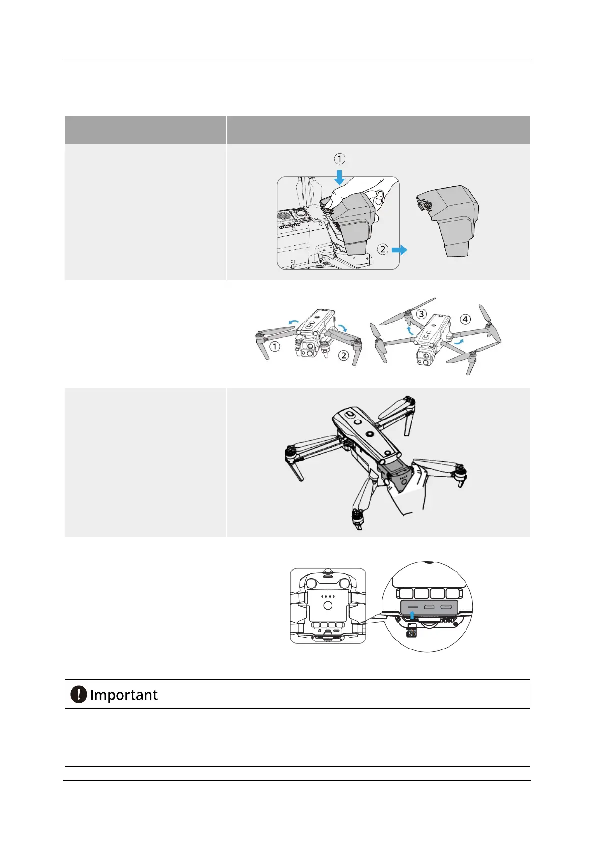 Before powering on the aircraft, unfold the front arms of the aircraft first, and then unfold