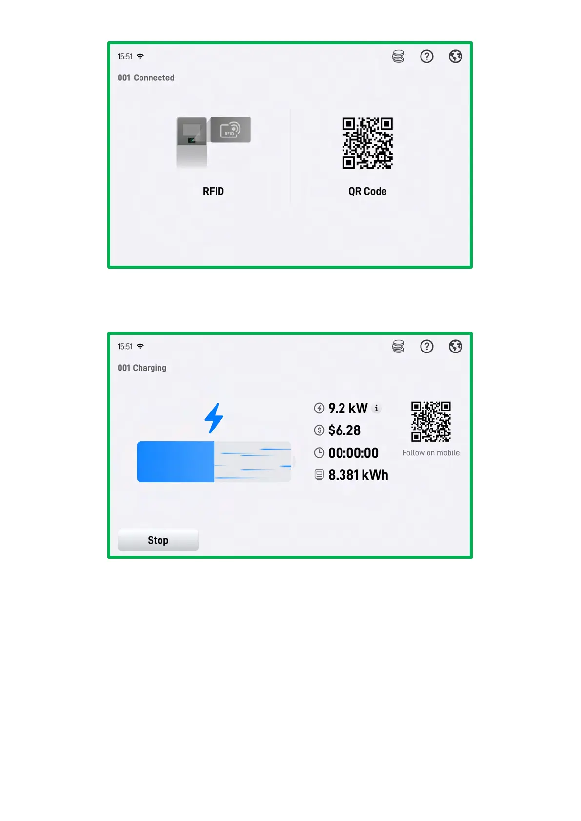 Choose a method (RFID card or QR Code) to authorize charging on the Authorization Screen.