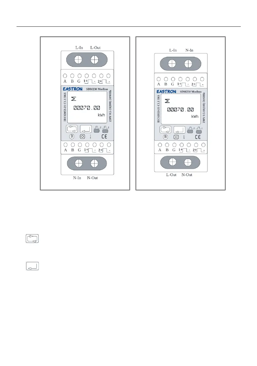 There are two buttons on the SDM230-Modbus V1 and SDM230-Modbus V2 meters: