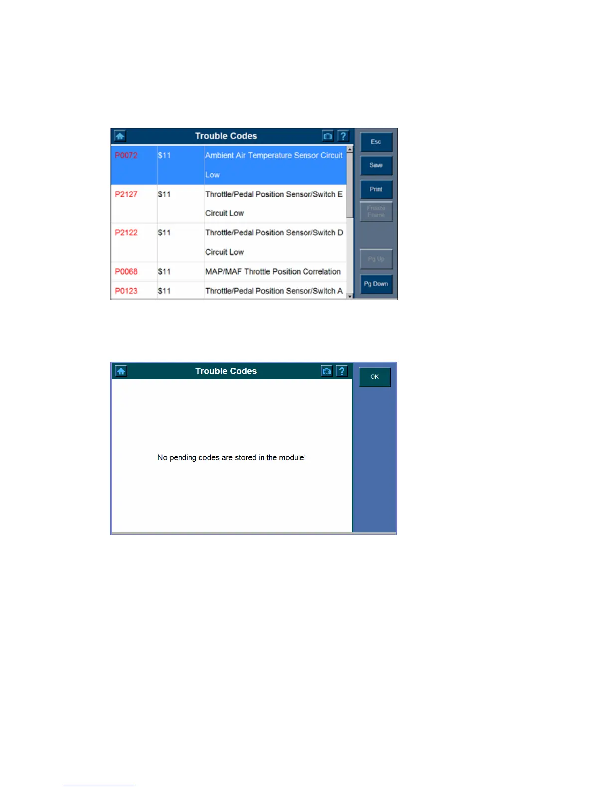 Note: If more than one Trouble Codes is found, use the Pg Up/ Pg Down or scroll