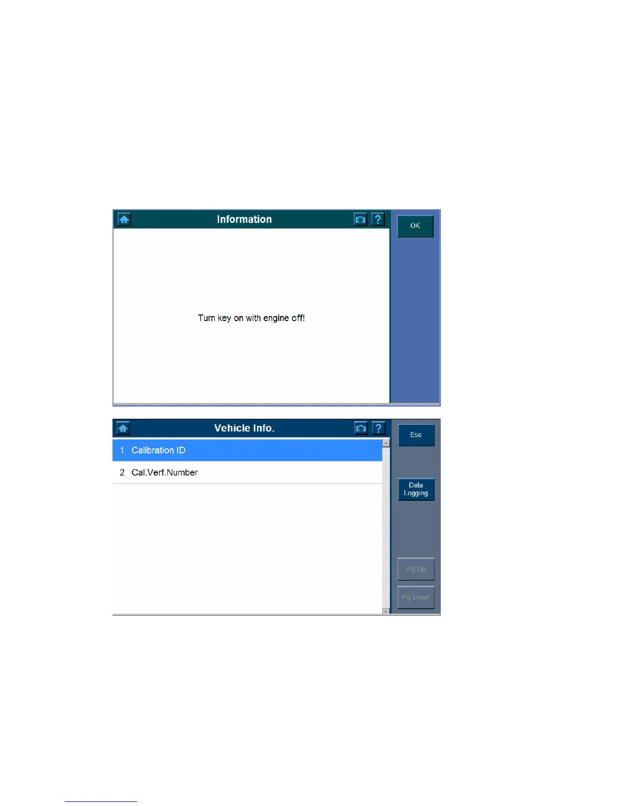 The Vehicle Info. enables retrieval of Vehicle Identification No. (VIN), Calibration ID Nos.
