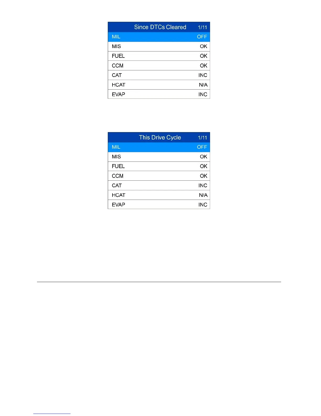 5) If the vehicle supports readiness test of “This Drive Cycle”, a screen of