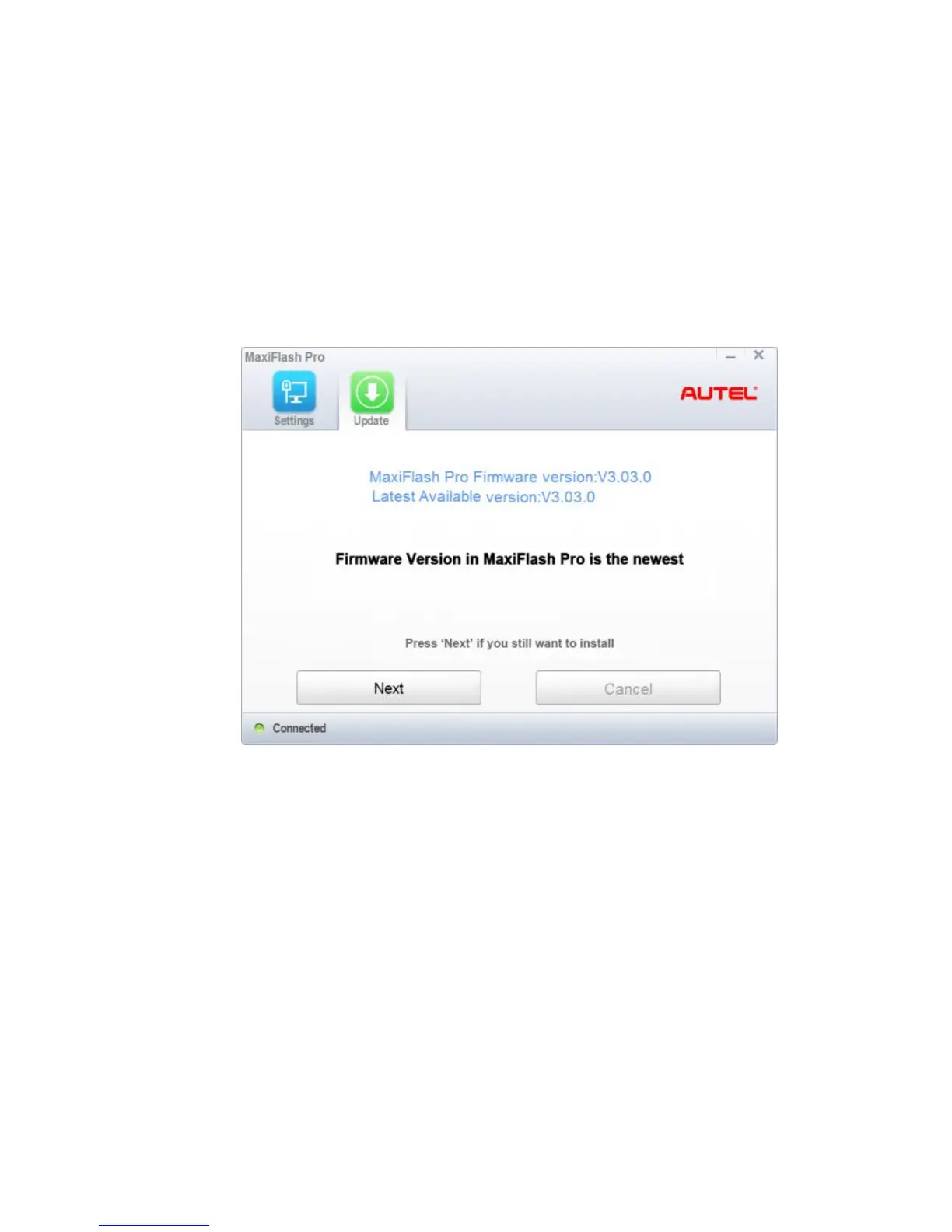 5 Press the “Next” button to install the newest firmware.