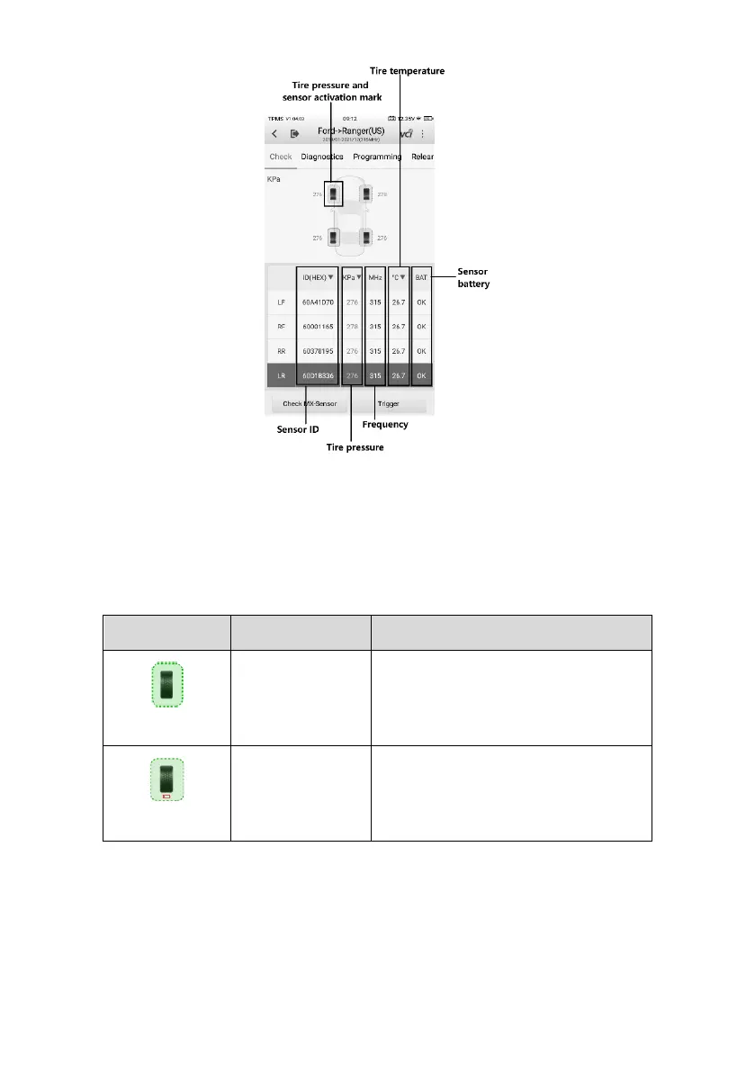 The sensor position, sensor ID, tire pressure, tire temperature, sensor frequency, and