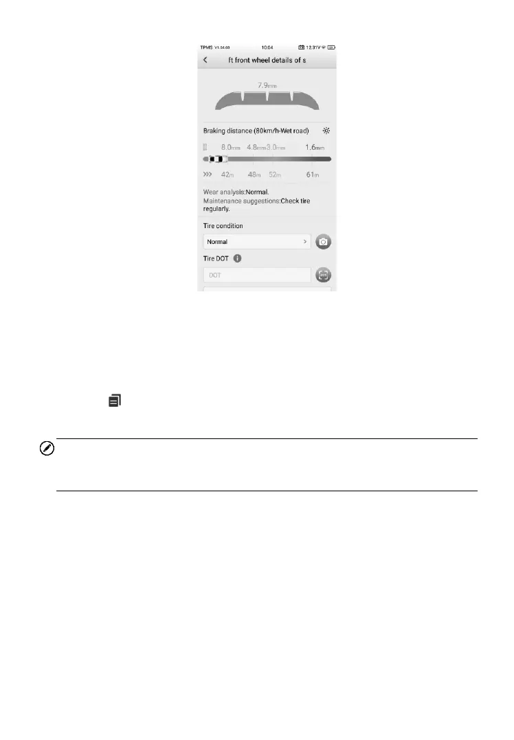 On the Wear detection screen, measurements and the tire/brake disc icon
