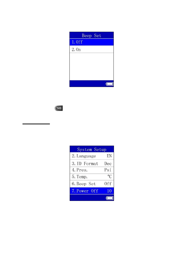 2) From Beep Set menu, use the UP or DOWN Arrow button to select OFF