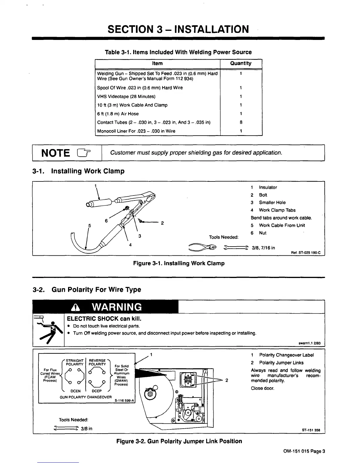 AUTO ARC 120 - SECTION 3 - INSTALLATION; INSTALLING WORK CLAMP; GUN POLARITY SELECTION