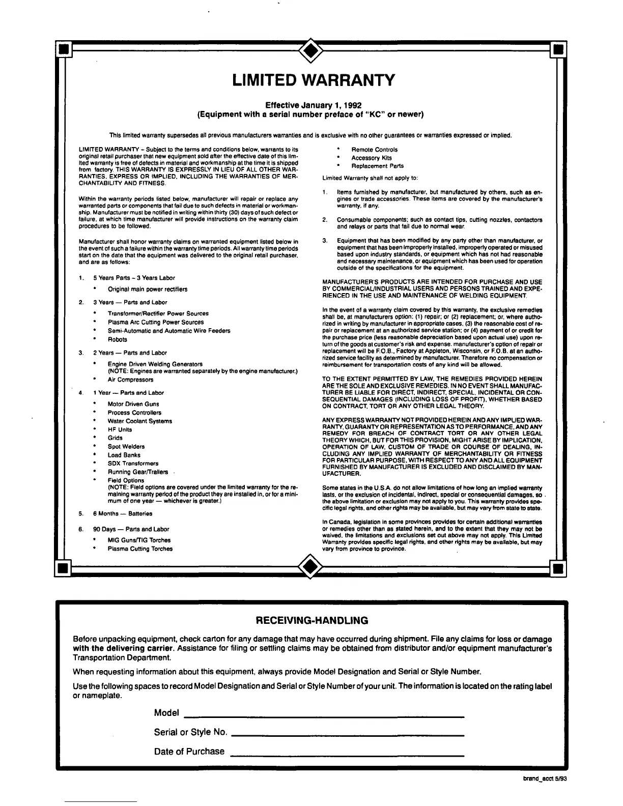 AUTO ARC 120 - LIMITED WARRANTY; RECEIVING AND HANDLING