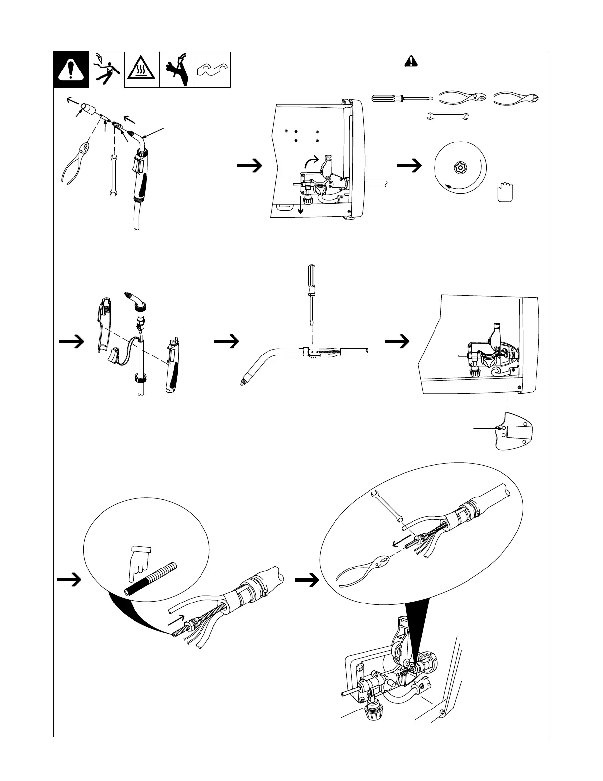 Remove nozzle. Cut off wire at contact tip,
