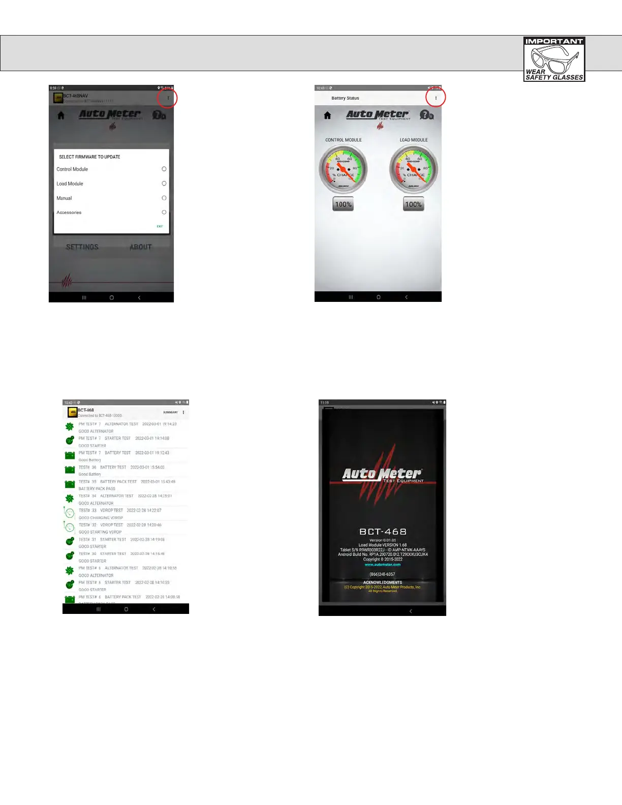 Auto Meter BCT-468 - Advanced Module Functions; Firmware Updates and Battery Status; Review Results and About Screen