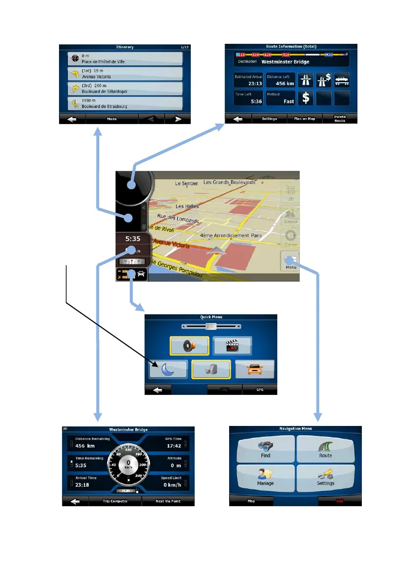 Menus directly accessible from the navigation screen (middle) by tapping the relevant panes on the display. Some useful functions are