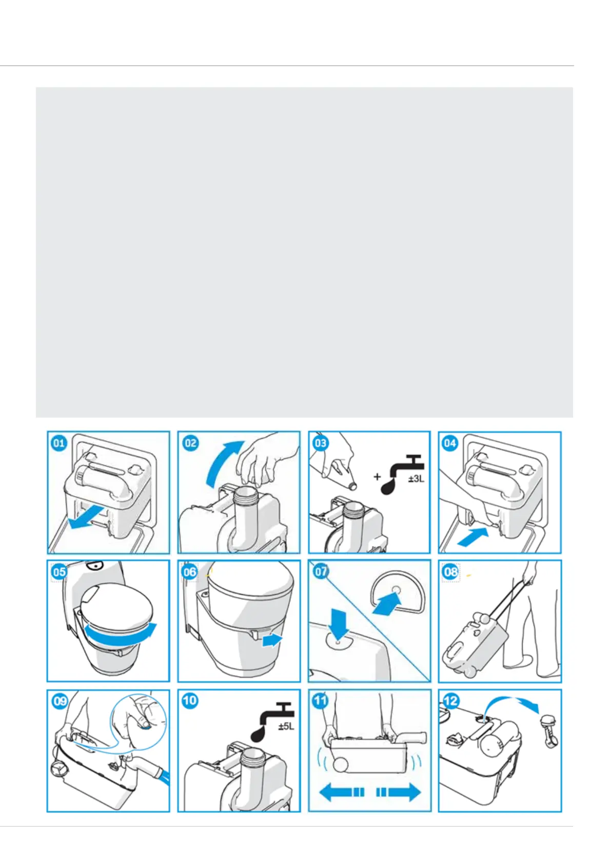 • Slide the waste-holding tank into the toilet and close the service door (04).