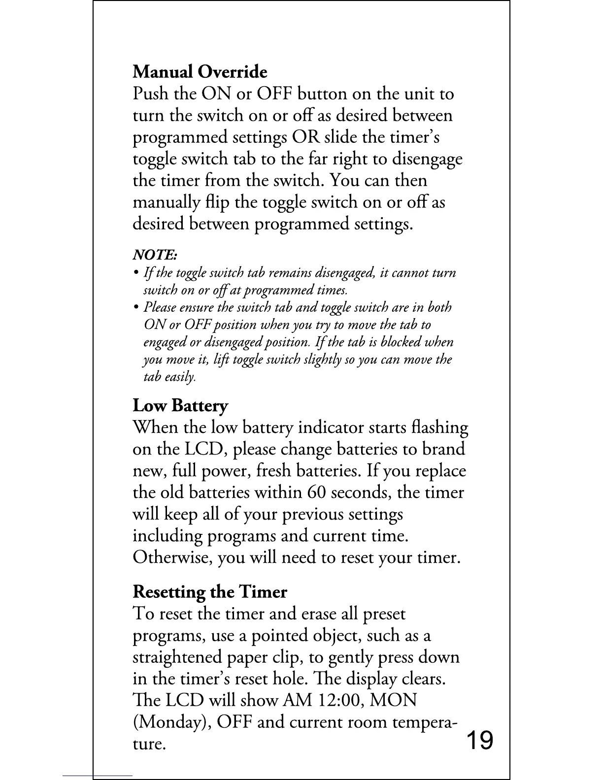 AutoChron Wall Switch Timer - Manual Override Operation; Resetting the Timer