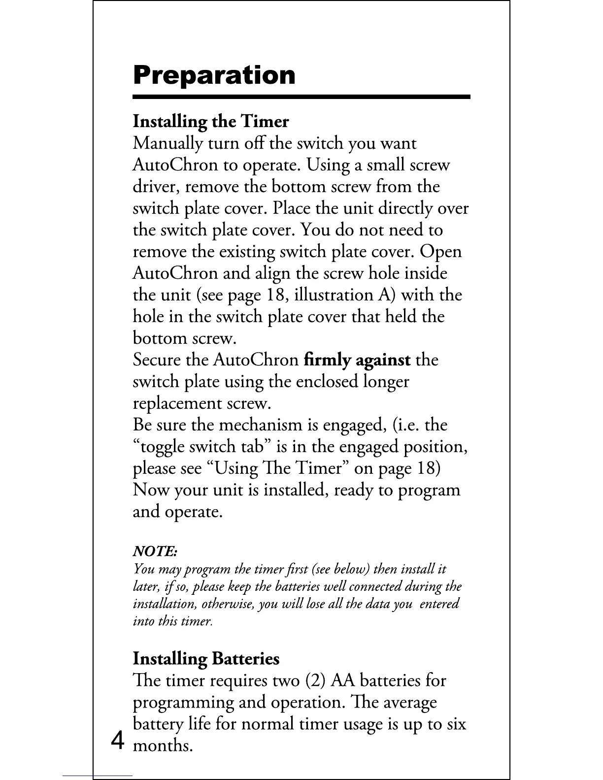 AutoChron Wall Switch Timer - Preparation; Installing the Timer; Installing Batteries