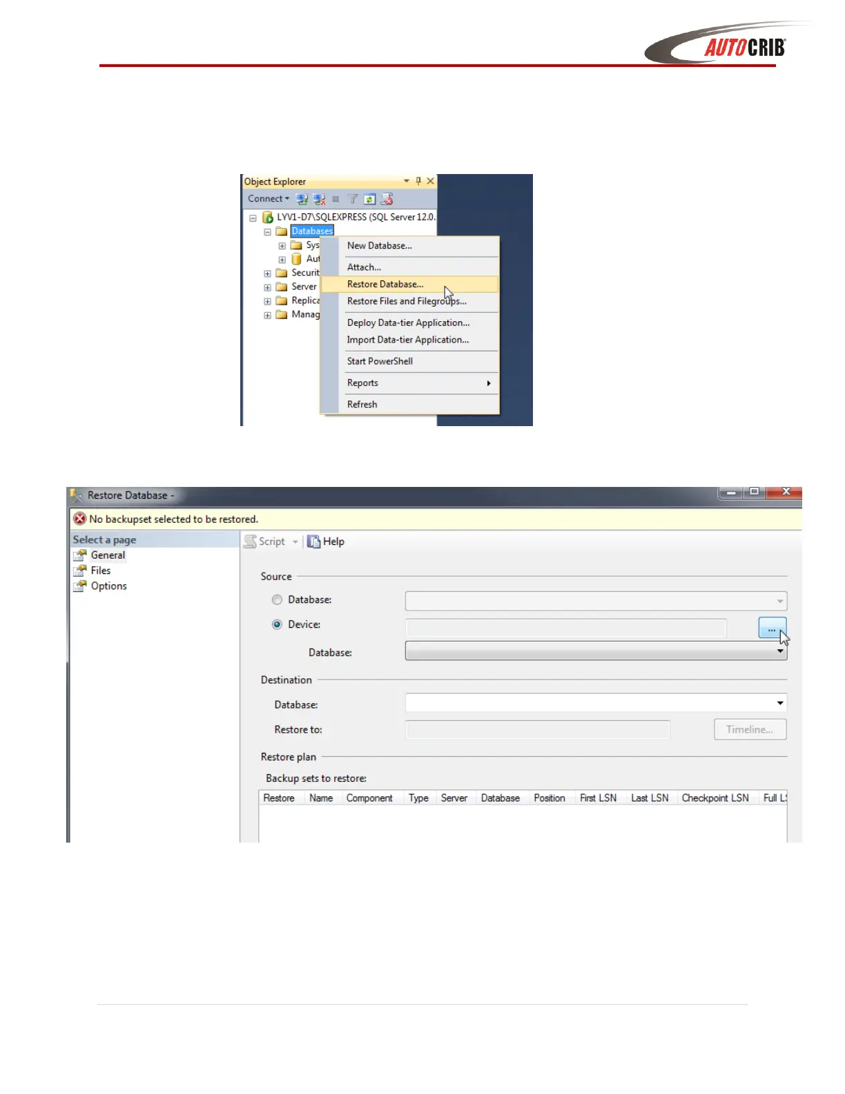 3. Right Click on the Databases folder and click on Restore Database…