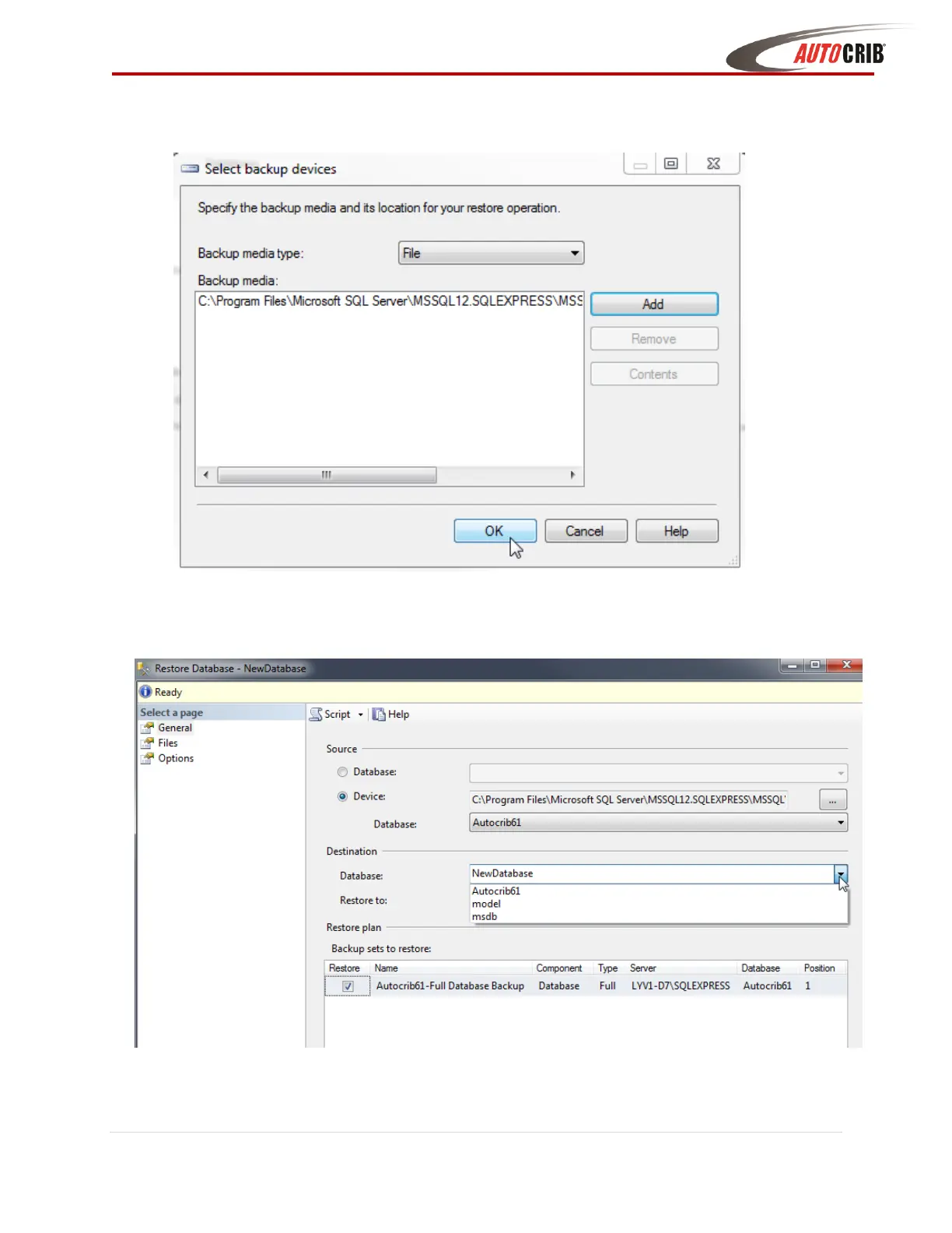 the Destination section of the screen select the name of the database to restore to from the