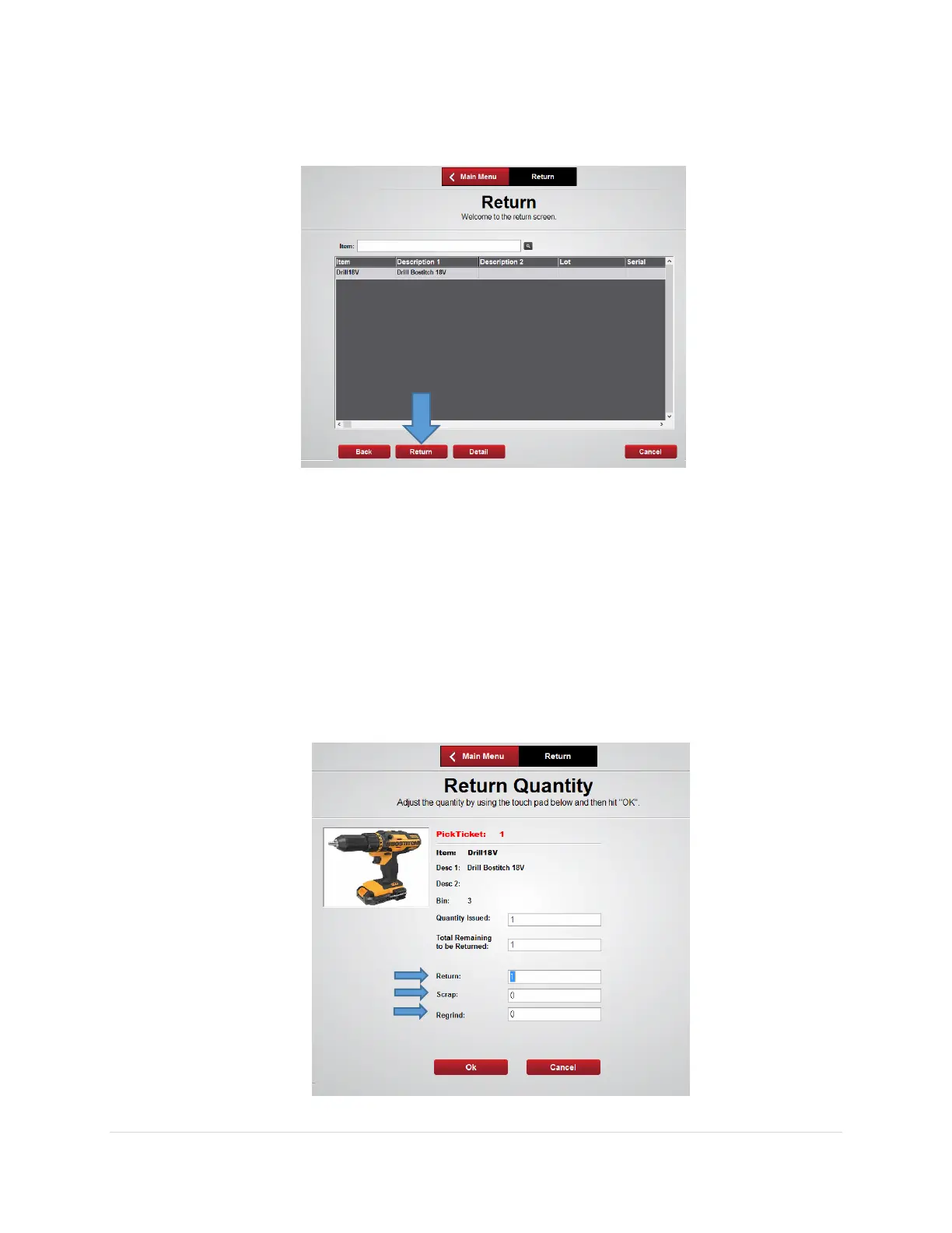 appropriate field; Return, Scrap, or Regrind then select Ok