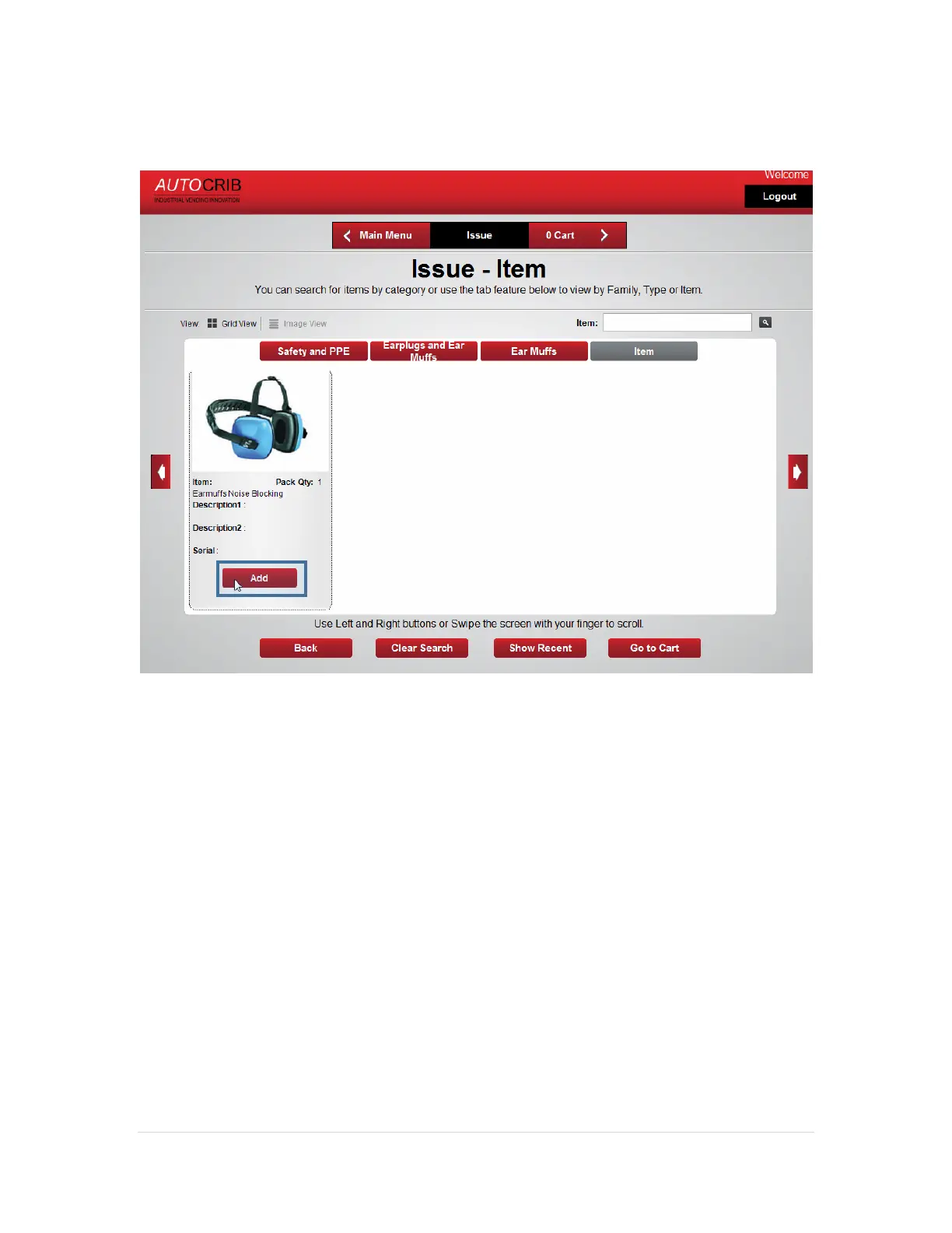 5. To issue an item, highlight the item name and press the Add button.