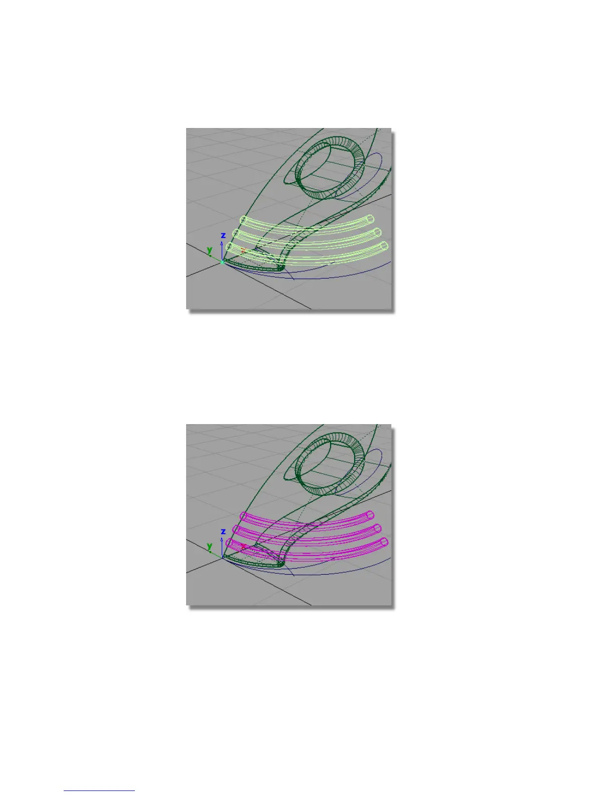 You will now intersect and trim the three extruded surfaces with the upper