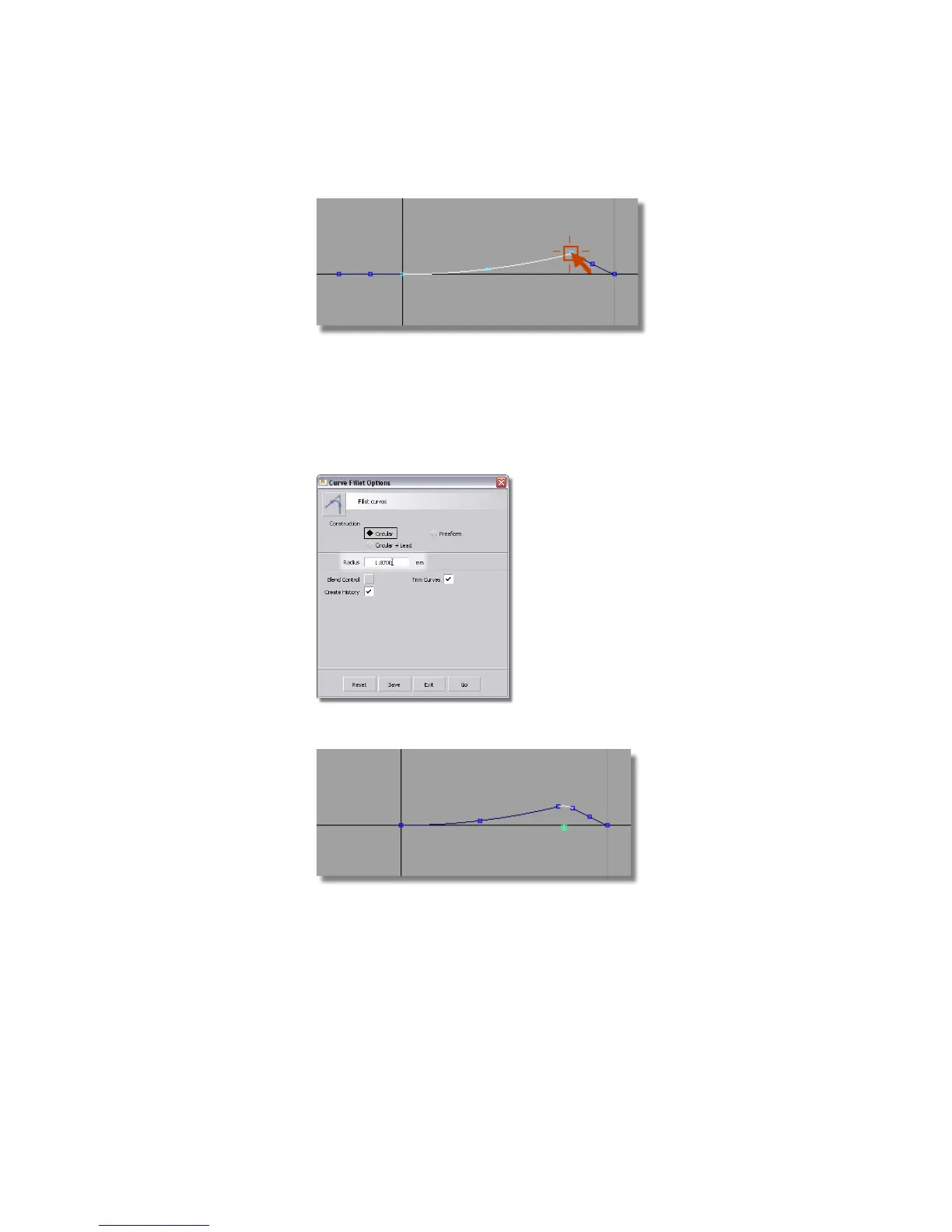 7 Choose Curve Edit > Create > Fillet Curves and double-click to open the