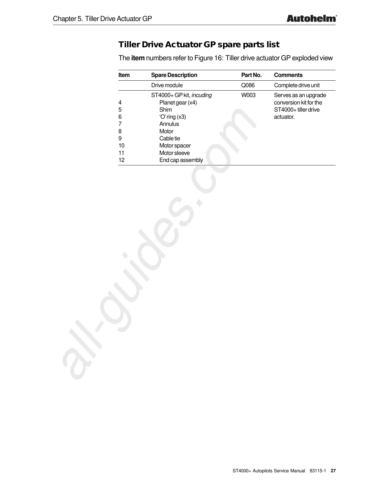 The item numbers refer to Figure 16: Tiller drive actuator GP exploded view