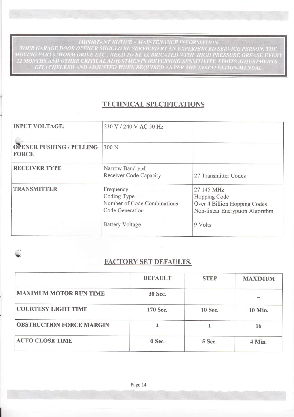 Automatic Technology Australia Securalift GDO 2v4 - Technical Specifications; Light Time