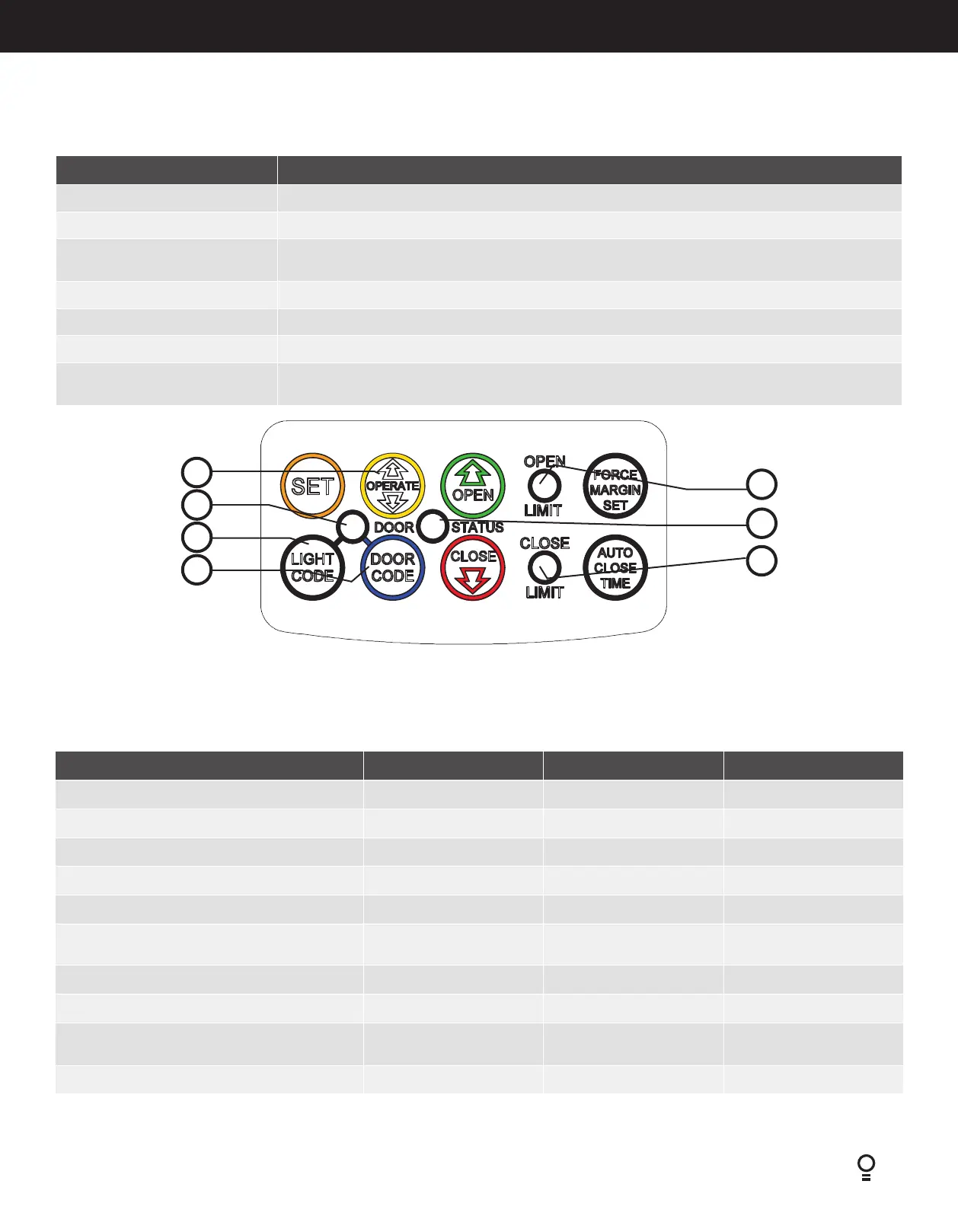 7. CLOSE LED (Red) Illuminates and flashes as the door opens closes, and remains on when the close limit position has been