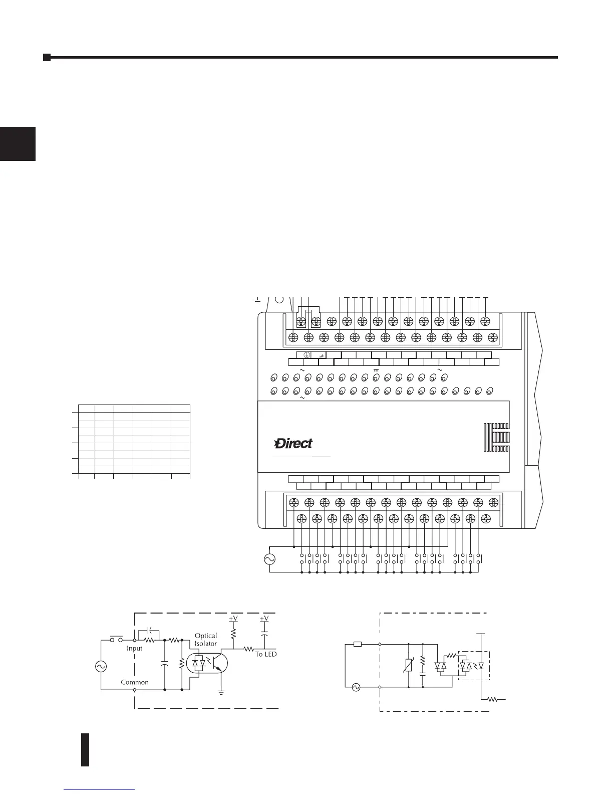 The D0–06AA PLC has twenty AC inputs and sixteen AC outputs. The following diagram shows a