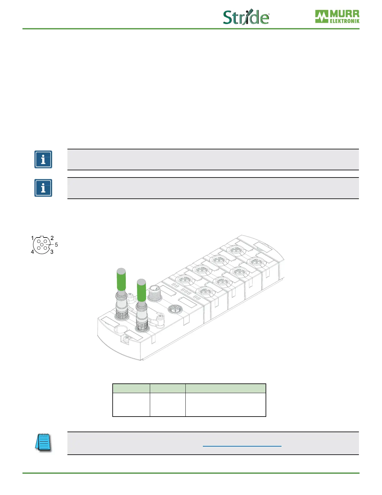 ◼ Sensors can be supplied via pin 1 (24V) and pin 3 (0V) of the M12 female connectors.