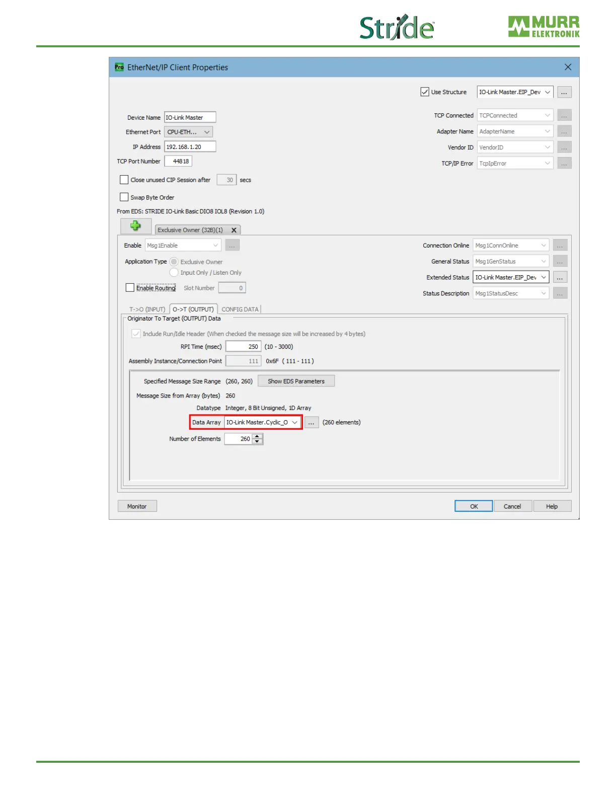 Fig. 7-18: EtherNet/IP Client Properties – IO-Link Master O->T Data Array.
